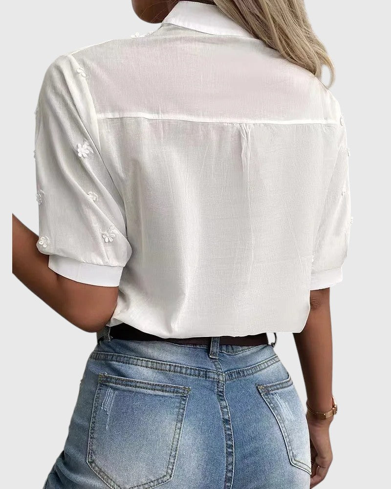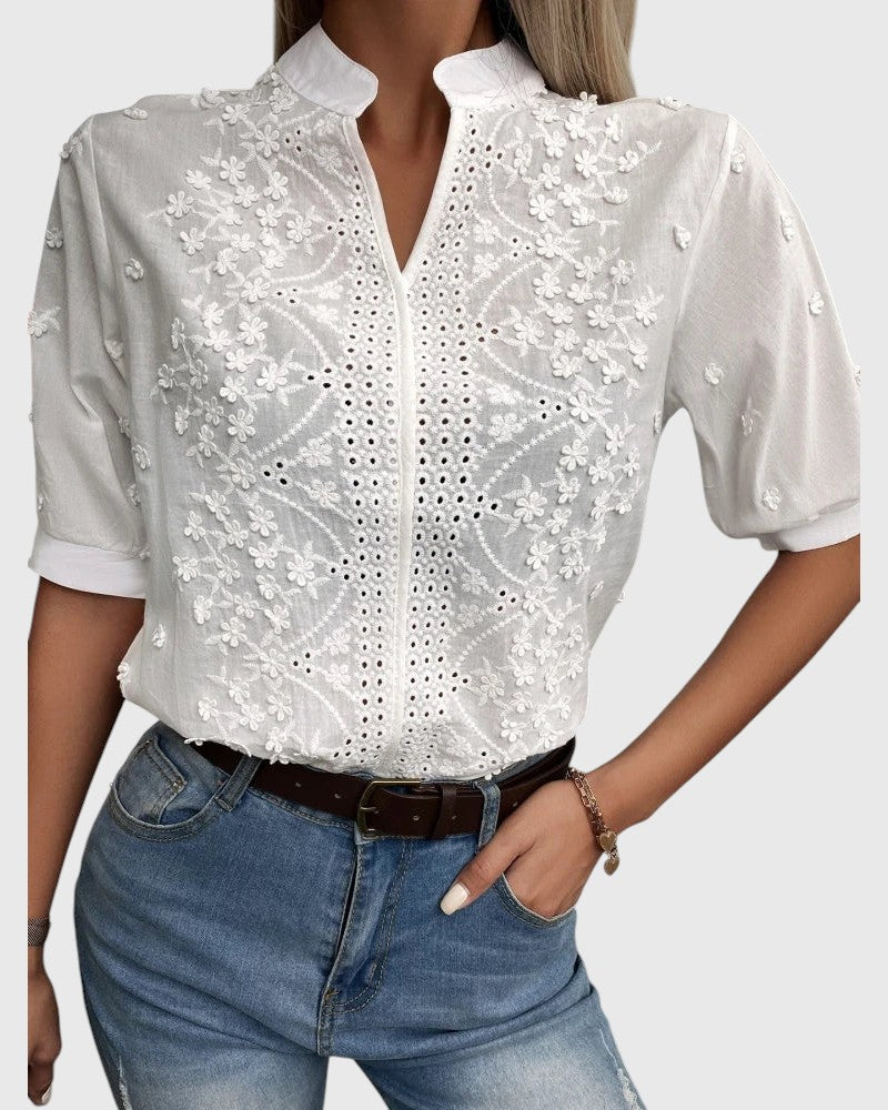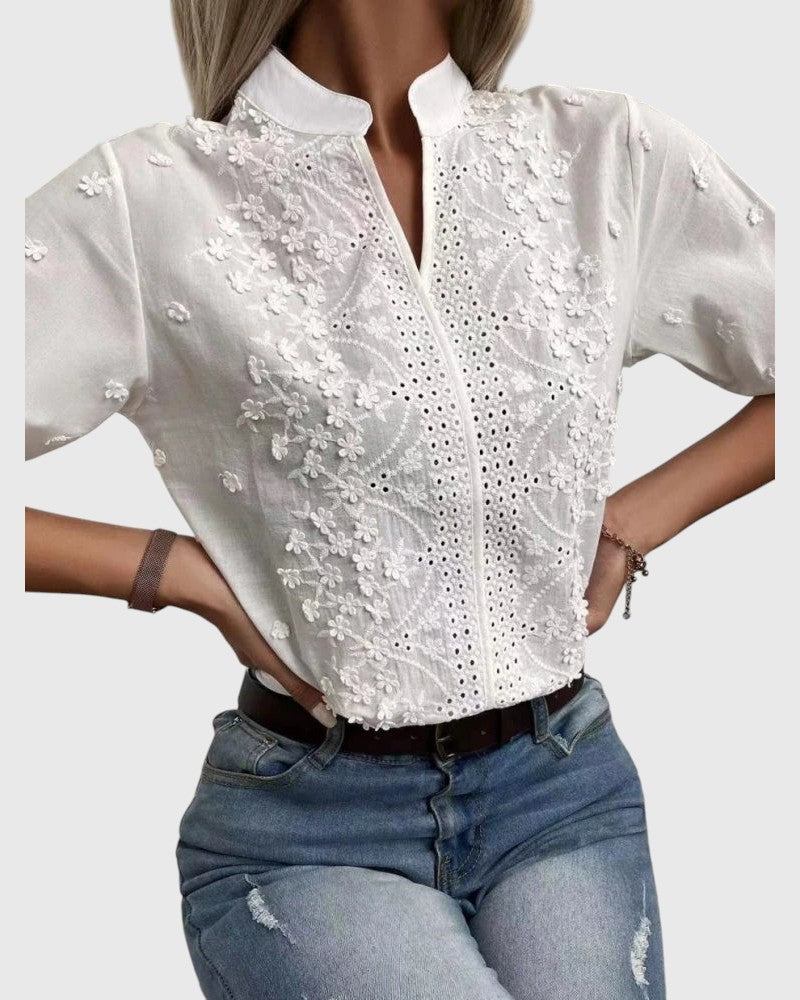 With the Camille - Blouse, you radiate sophistication and effortless relaxation. The delicate floral embroidery and lightweight puff sleeves give your look a romantic touch. Made from soft, breathable fabric — perfect for enriching your summer days with comfort and charm.