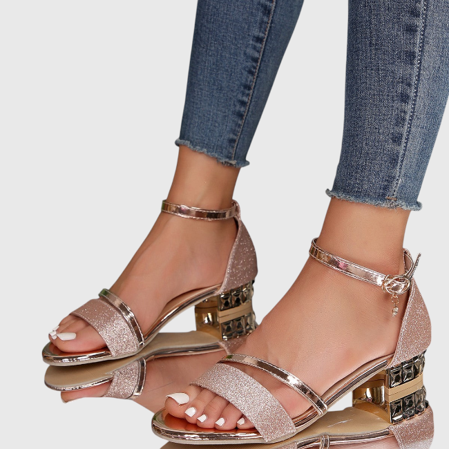 Xaria – Block Heel Ankle Strap Sandals – Shine with Every Step
